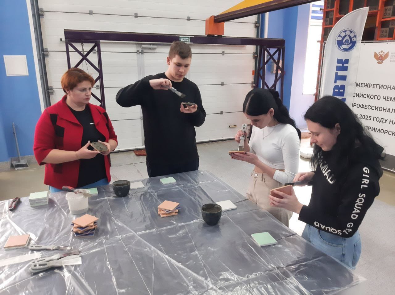 Преподаватели и студенты строительных специальностей провели мастер-классы по облицовке плиткой, декоративной штукатурке и малярным работам.