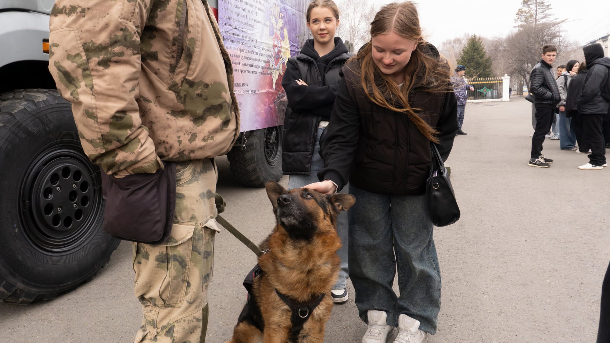 Не меньше эмоций вызвала демонстрация работы служебных собак. Кинологи показали несколько тренировочных упражнений — студенты увидели, как животные ищут запрещённые вещества и отрабатывают навыки задержания.